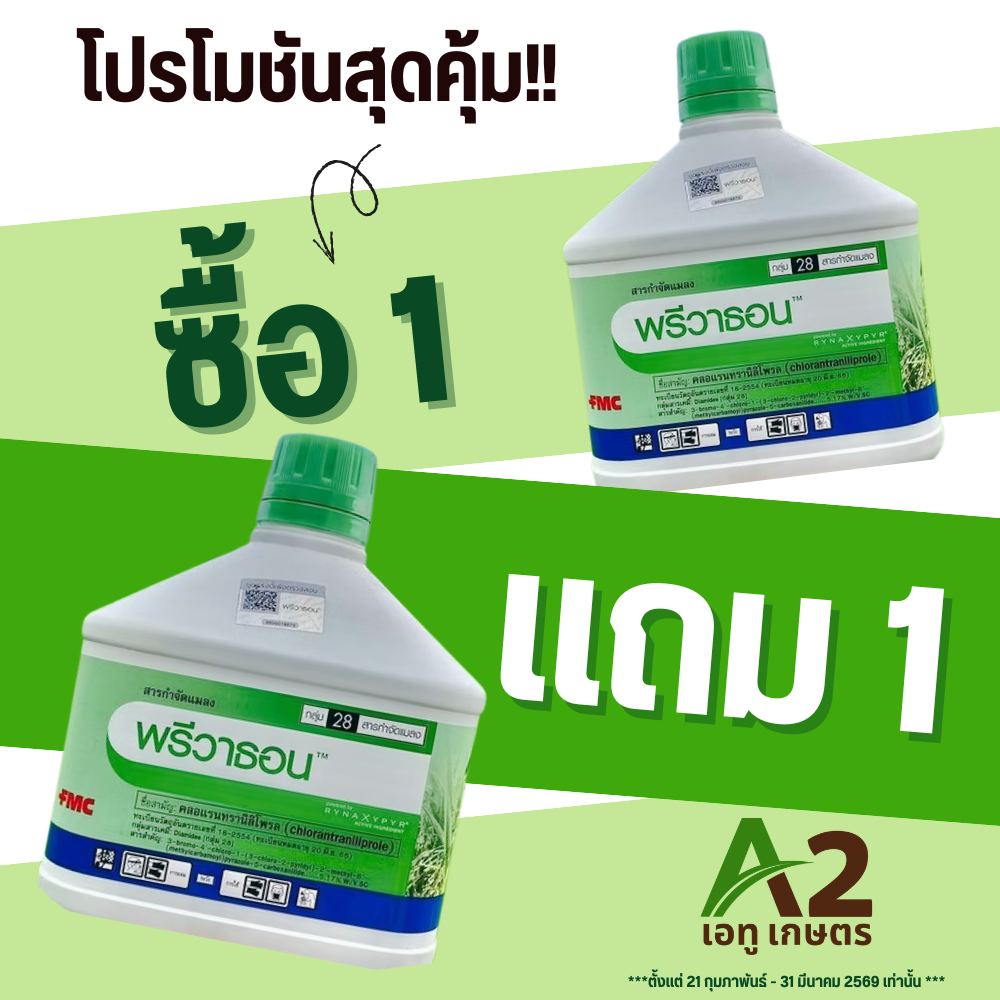 ซื้อ 1 แถม 1 พรีวาธอน! พรีวาธอน (Prevathon) คือสารป้องกันกำจัดแมลงศัตรูพืชประเภทหนอนที่ได้รับความนิยมสูง มีชื่อสามัญคือ คลอแรนทรานิลิโพรล (Chlorantraniliprole) ผลิตโดยบริษัท FMC ออกฤทธิ์เร็ว ทั้งแบบถูกตัวตายและกินตาย (Contact and Ingestion) จัดเป็นยาเย็นที่ใช้ได้กับทุกช่วงพืช กำจัดหนอนกอข้าว หนอนห่อใบข้าว หนอนกระทู้ หนอนใยผัก และหนอนดื้อยาต่างๆ ได้อย่างมีประสิทธิภาพสูง คุณสมบัติและจุดเด่น ชื่อสามัญ: คลอแรนทรานิลิโพรล 5.17% W/V SC กลไกการออกฤทธิ์: ขัดขวางการทำงานของกล้ามเนื้อ ทำให้หนอนหยุดกินและตายอย่างรวดเร็ว (กลุ่ม 28) ประสิทธิภาพสูง: เหมาะสำหรับหนอนที่ดื้อยา หรือหนอนหนังเหนียว เช่น หนอนกอ หนอนห่อใบข้าว หนอนเจาะสมอฝ้าย หนอนกระทู้ เป็นยาเย็น: สามารถฉีดพ่นได้ทุกระยะของพืช ไม่เป็นพิษต่อปลา กบ และผึ้ง ทนฝน: ทนต่อการชะล้างของฝนได้ดีประมาณ 2 ชั่วโมงหลังฉีดพ่น